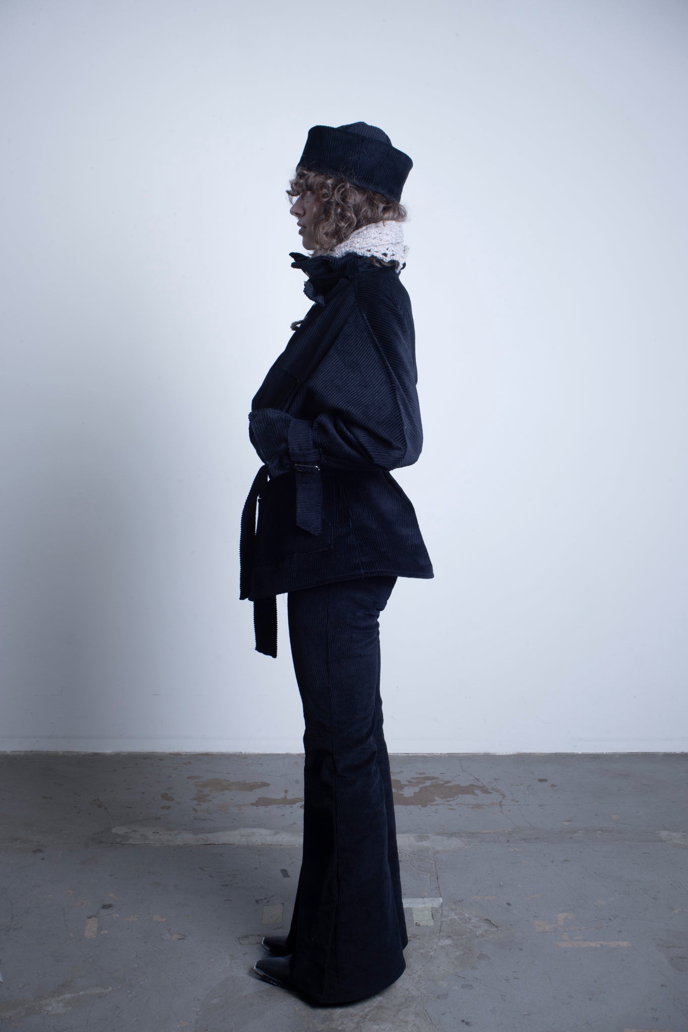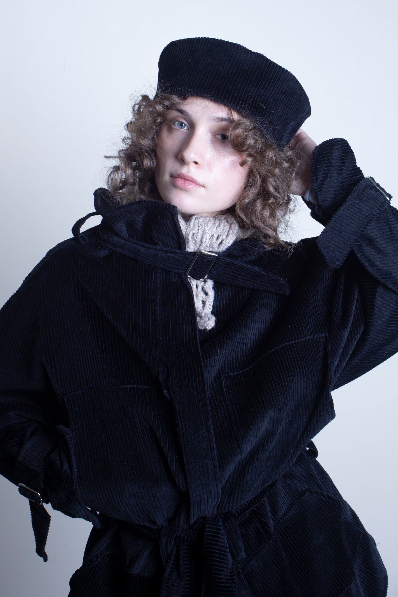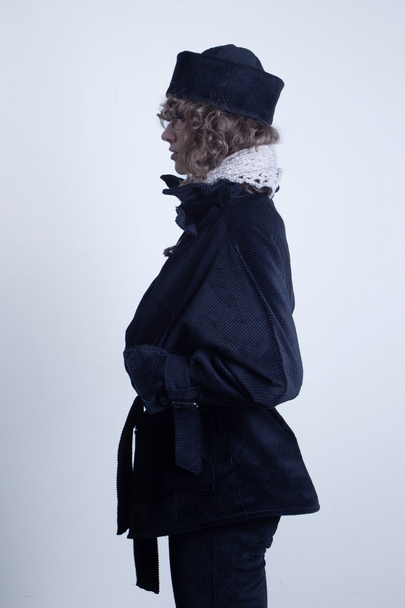 This oversized jacket is cut from rich corduroy, offering a sculptural silhouette that feels both protective and effortless. With its adjustable belt, deep front pockets, and subtle utilitarian references, it transforms comfort into confidence.